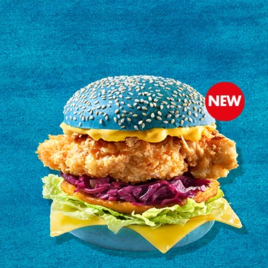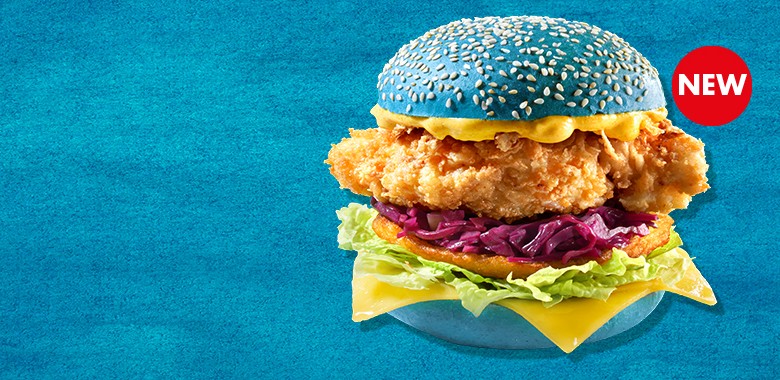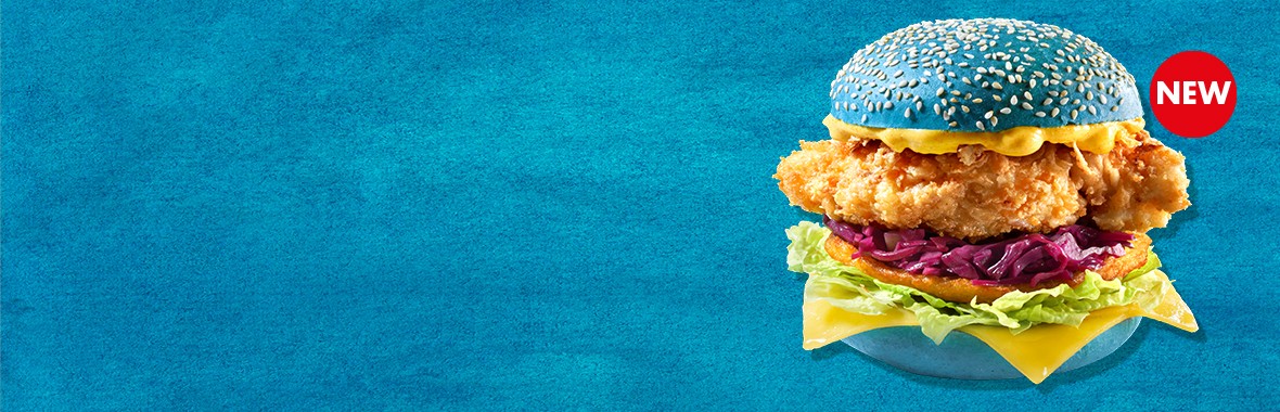 Chrupiąca miruna w panierce, placek ziemniaczany, wędzony majonez, prażona cebulka, cheddar a wszystko to zamknięte w niebieskiej bułce! Feel the BLUes!