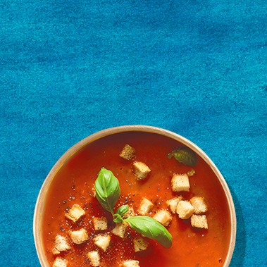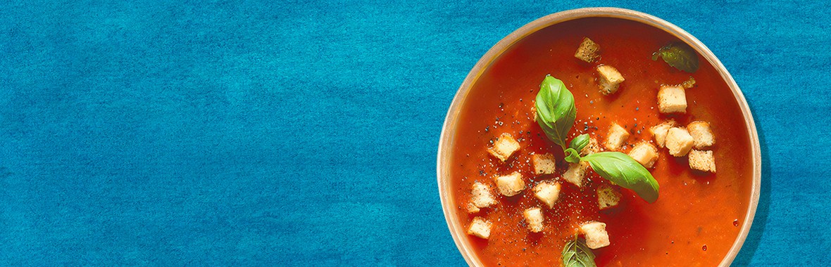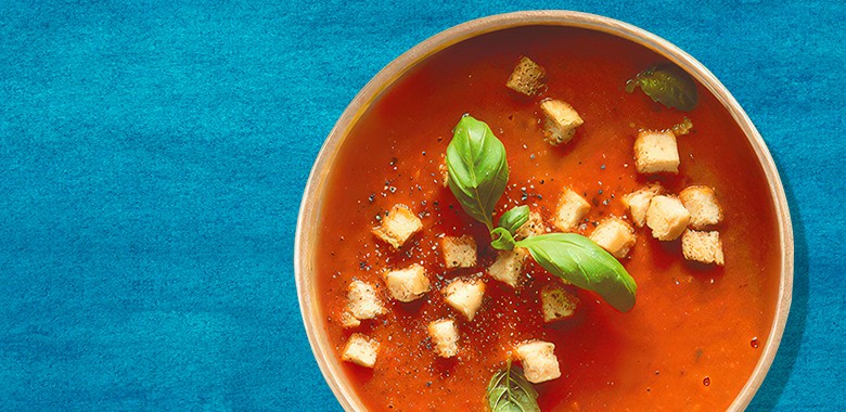 rozgrzewająca zupa krem z pomidorów z chrupiącymi grzankami.